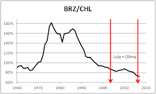 O Chile, depois do golpe de Pinochet parecer estar a perder a corrida contra o Brasil onde o PIB pc relativo passou de 90% para 160%, depois de 1988 a tendência inverteu-se e hoje o PIB pc brasileiro está quase 20 pontos abaixo dos valores de 1960. E esta tendência de perda relativa não foi alterada com Lula+Dilma.