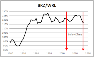 No crescimento económico, houve uma duplicação relativamente à tendência de 1975:2002 (ver, Fig. 2) mas isso esteve apenas ligado ao crescimento mundial a ponto de, em termos relativos, o Brasil se ter tornado mais pobre. Se em 2002 o PIB pc brasileiro estava 22% acima da média mundial, em 2016 já só estava 17% acima (Ver, Fig. 1).