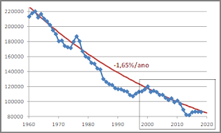 Metendo os dados disponíveis no Banco Mundial e no INE para os nados vivos, observamos oscilações conjunturais em torno de uma contínua tendência de redução de 1,65% por ano (ver, Fig. 1).