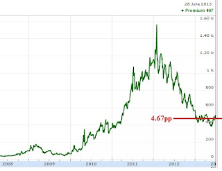Apesar do razoável processo de ajustamento, como o stock de divida na mão dos privados está a diminuir, apenas será previsivel observar uma diminuição significativa do prémio de risco da dívida pública se as nossas contas públicas evoluírem de forma muito favorável. Isto é, atingirem rapidamente o "equilíbrio do saldo primário" (em finais de 2013) e um défice público de 3.0% em 2015 (um pequeno resvalar no objectivo de 2.5%).