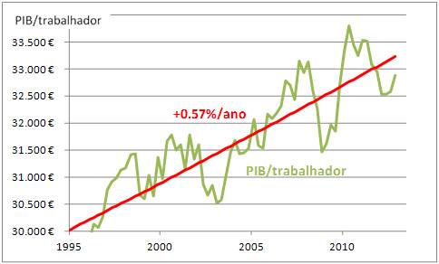 Apesar de o PIB estar a diminuir desde o tempo do Sócrates (3.º trimestre de 2010 até ao 4.º trimestre de 2012 diminuiu 6.8%), essa queda é completamente resultado do aumento do desemprego pois o produto por trabalhador está estável (ver, fig. 2).